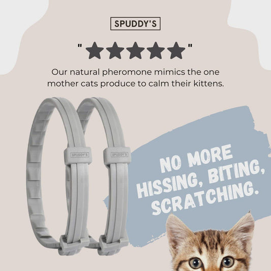 Discover the power of peace and calm with Spuddy's & Friends. Our natural, hypoallergenic collars provide fast-acting relief for even the most anxious of cats, improving behavior and reducing stress-related problems.